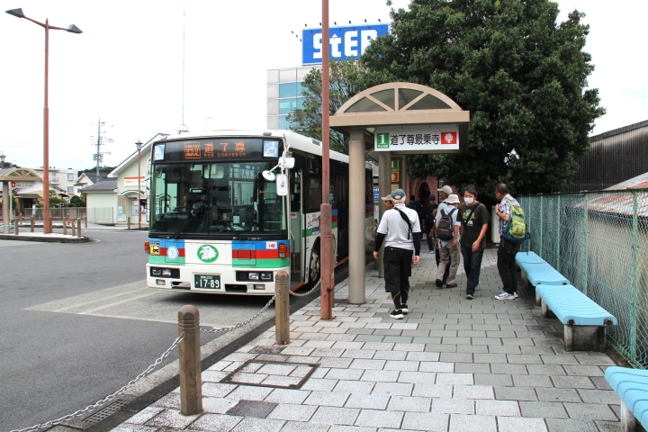 ・大雄山駅の改札を出て右奥の1番乗り場から道了尊行きに乗車・歩こう会では、途中の仁王門でバスを降り「天狗の小道」を2キロメートル歩く、樹齢500とも言われる杉並木に癒された。【雨天・雨上がりスリップ注意】道は整備されていましたが、コンクリートのブロックには所々コケが生えており危険な状態です。終点のバス停「道了尊」まで乗車お勧め。