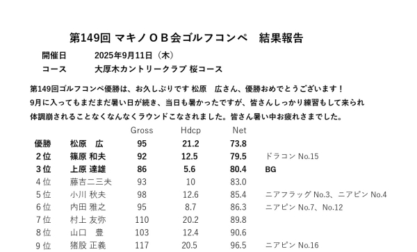 第149回マキノOB会ゴルフコンペ9月11日(木)の結果報告。