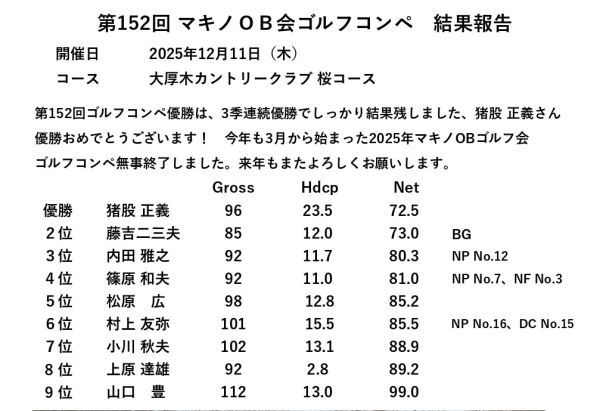 第152回マキノOB会ゴルフコンペ12月11日(木)の結果報告。