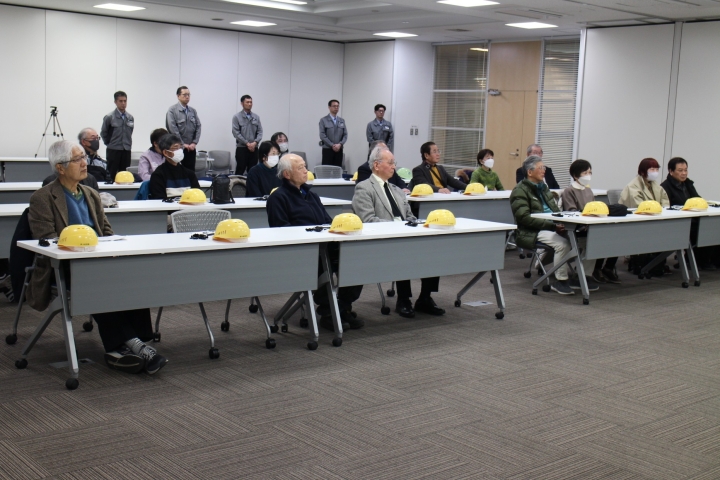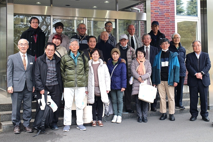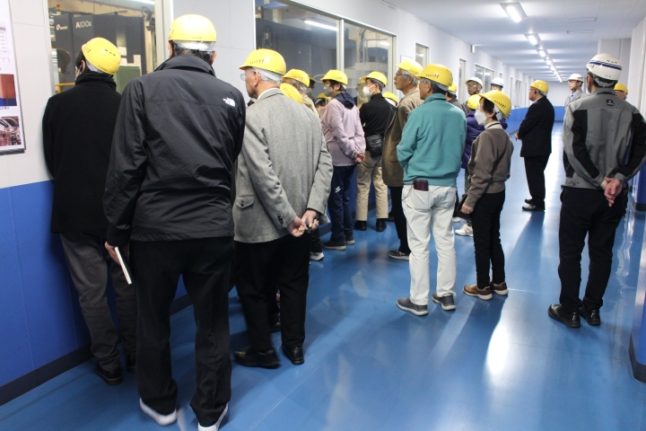 ④今回の工場見学の参加者は20名でした。特筆すべきは誠に嬉しことにご婦人5名の参加があったことでした。文字通り現役時代に会社で元気に良い成果を出せたのは、奥様方の支えのお陰様あってのこと。口々に奥様から「良い会社ね」の微笑みが聞こえました。後列には、会社幹部の説明メンバーが、まるでSPのように寄り添って。