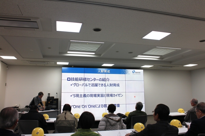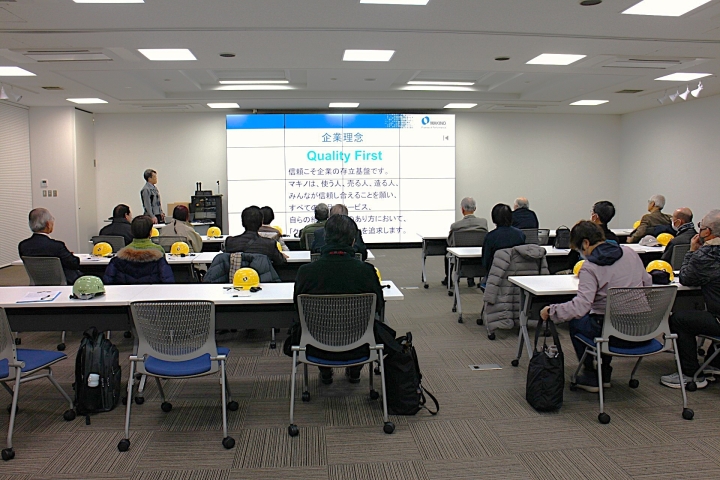 マキノOB会 2026厚木工場見学会のA棟5階での社長挨拶・厚木事業所長の説明を写真No,①~④順にご案内。