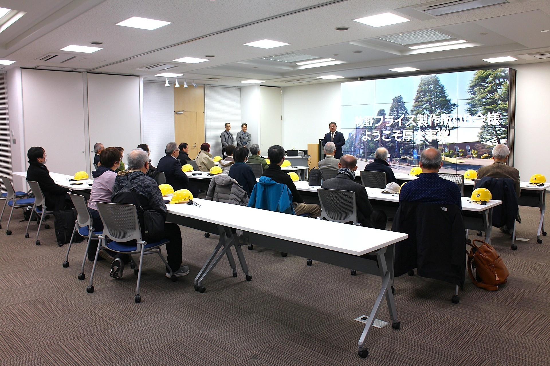 正面のパネルの高さは約3メートル幅5メートルで200インチと目測、写し出されたメツセージは「牧野フライス製作所OB会様 ようこそ厚木事業者へ」これを拝見したOB会メンバーは、胸震えた感動の一時でございました。