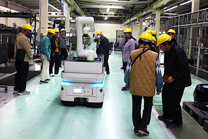⑦正面に来たのは、製造支援ロボット iAssist これから加工に使う工具をお届け中です。「奥様曰く、あら私に近づいたら止まってくれたわ!」そうなんです、ご主人と同じように優しいロボットです。